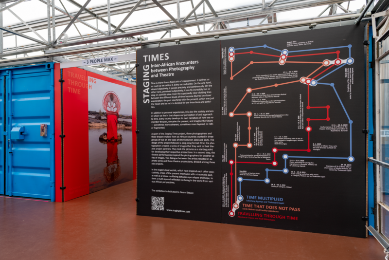 Dans le cadre du projet „Staging Times“, les photographes Lebohang Kganye (Afrique du Sud), Sarah Waiswa (Ouganda) et Aboubacar Traore (Mali) et les trois metteurs en scène Thokozani Kapiri (Malawi), Freddy Sabimbona (Burundi) et Noël Minoungou (Burkina Faso) ont exploré le thème du „temps“ en trois groupes de deux entre 2018 et 2020.